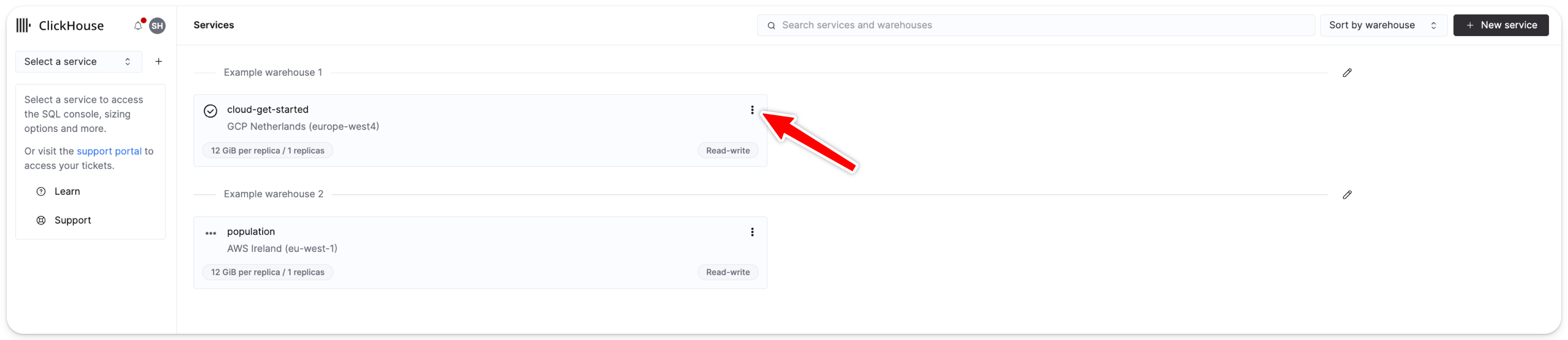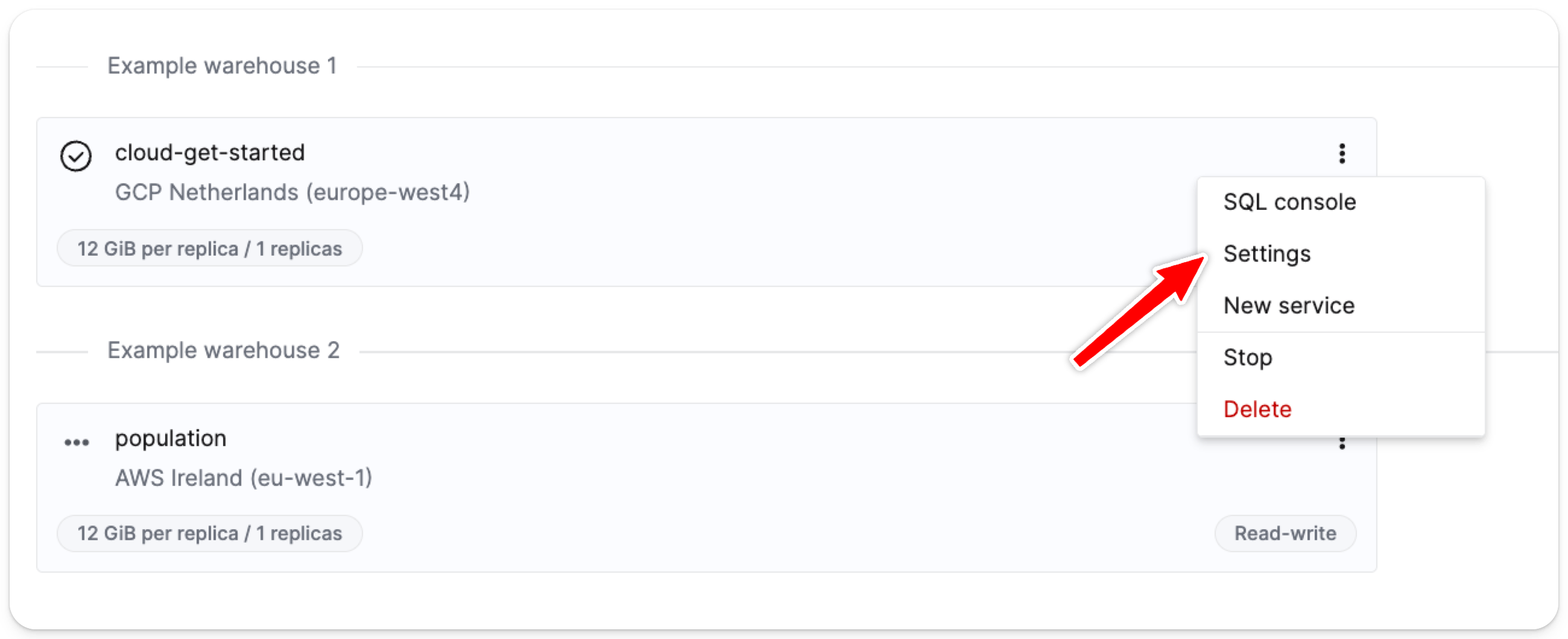 서비스 페이지에서 SQL 콘솔 액세스 설정을 조정하려는 서비스의 오른쪽 상단에 있는 메뉴를 클릭합니다.