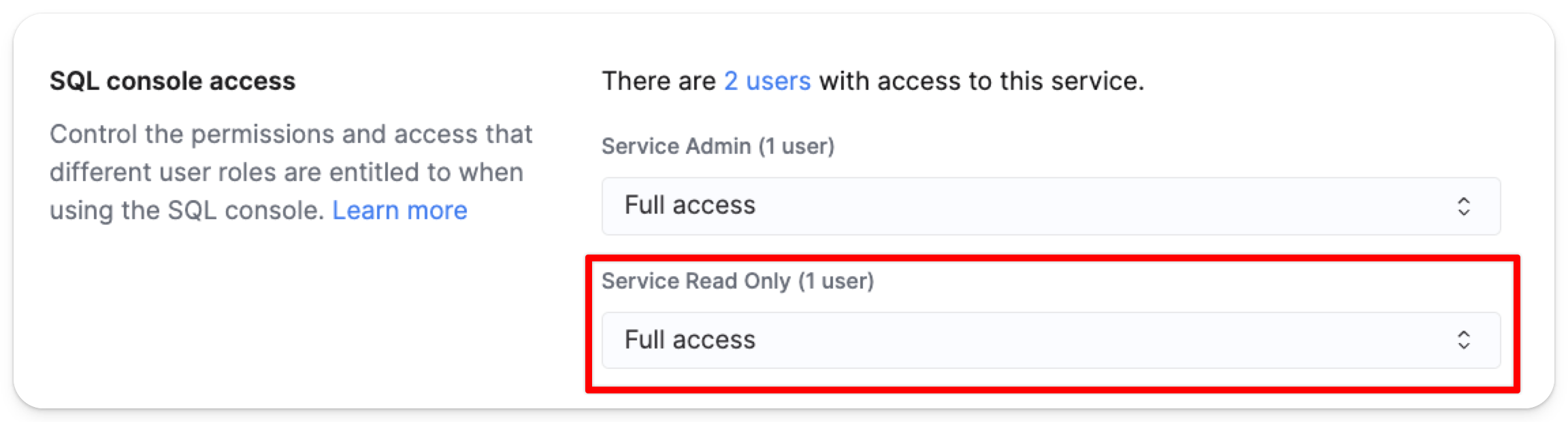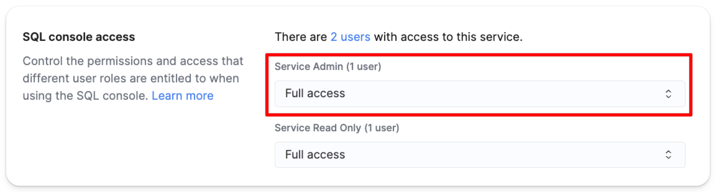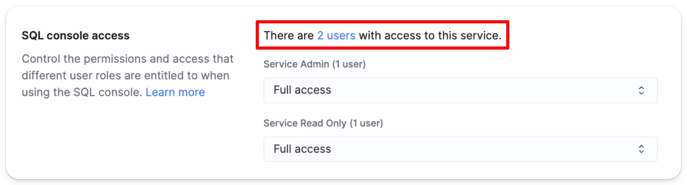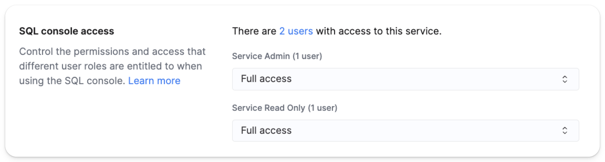 이 가이드는 SQL 콘솔 역할 할당을 구성하는 방법을 설명합니다. 역할 할당은 콘솔 전체의 액세스 권한과 사용자가 Cloud 콘솔 내에서 사용할 수 있는 기능을 결정합니다.