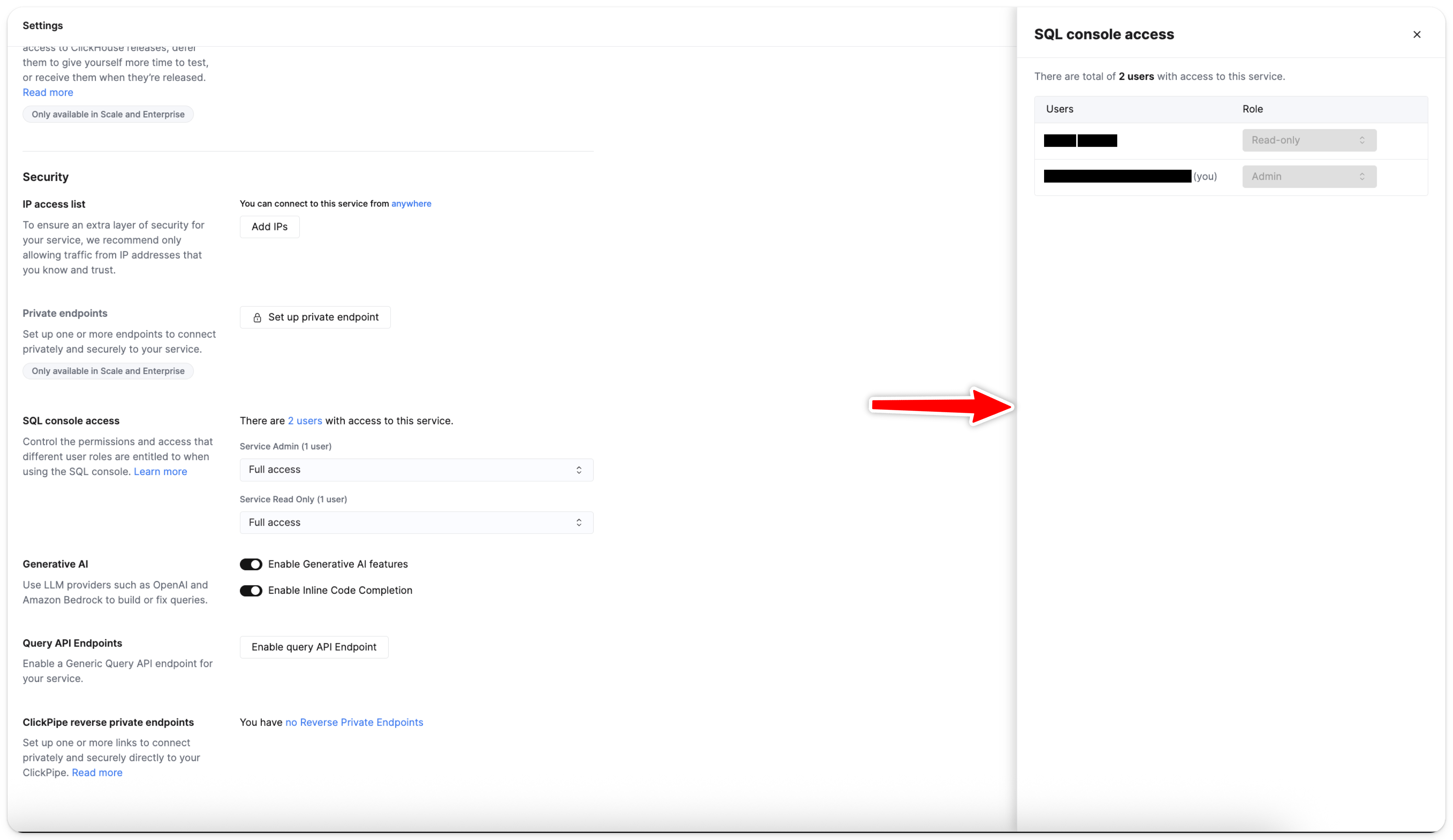 「Security」 섹션에서 「SQL console access」 영역을 찾습니다: