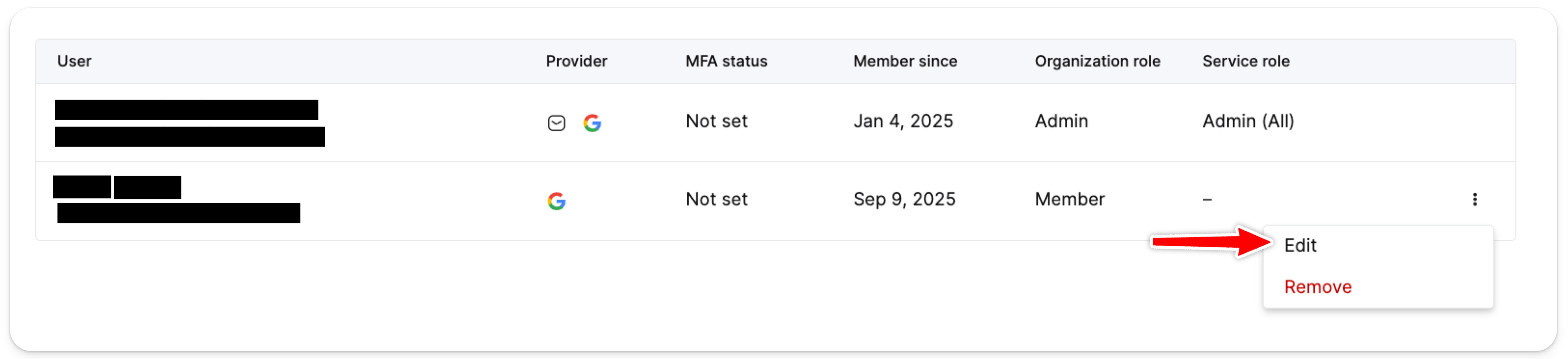 Users and roles를 클릭합니다.- 사용자 이름 옆의 점 세 개 아이콘을 클릭한 후